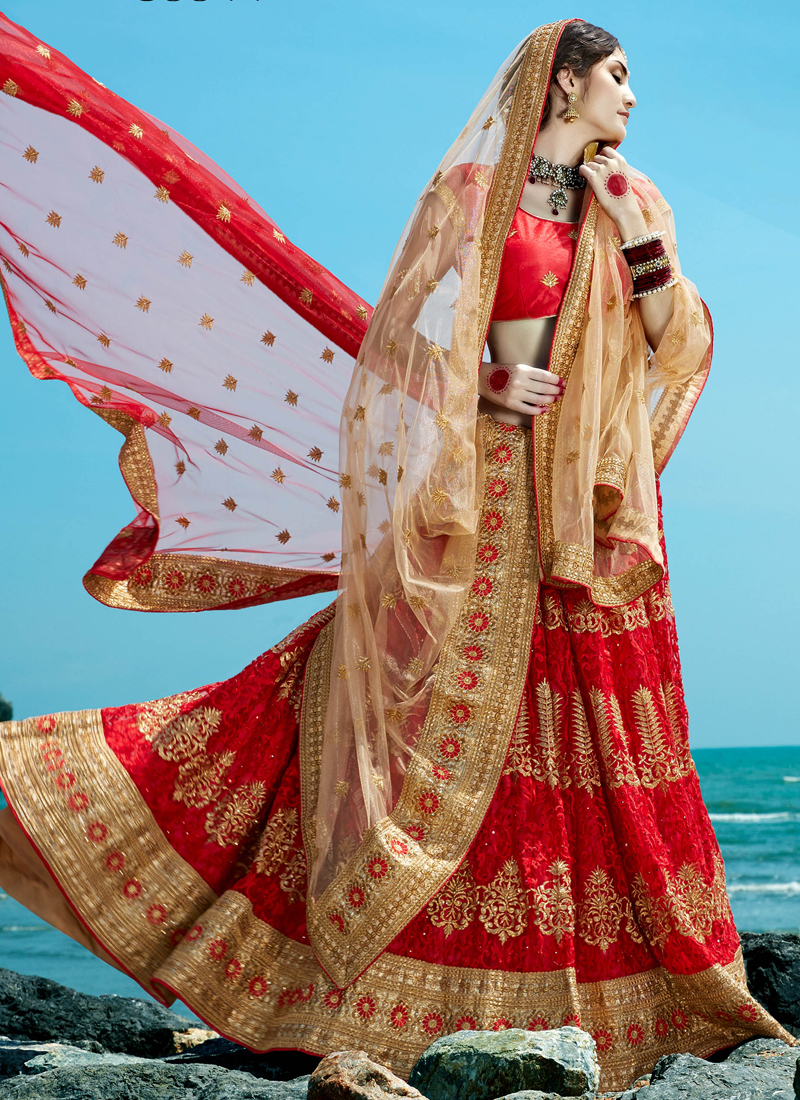 Red Satin Embroidered Heavy Designer Indian Wedding Lehenga Choli